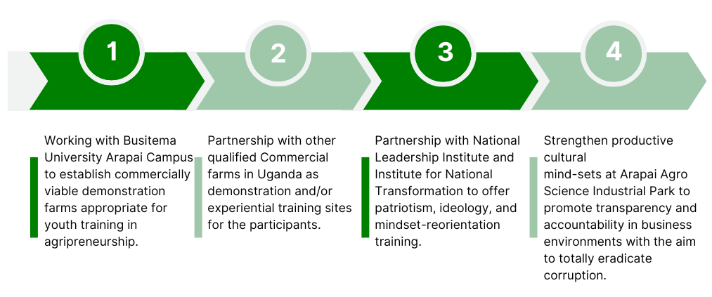 To be a leading centre of excellence in skilling youths on agribusiness with integrity to embark on building Ugandan agriproduct brands.